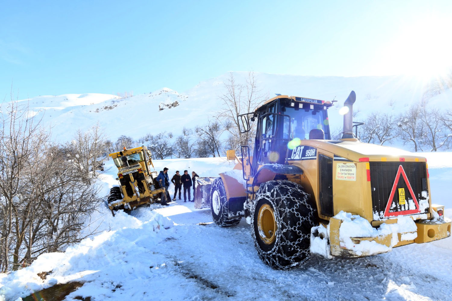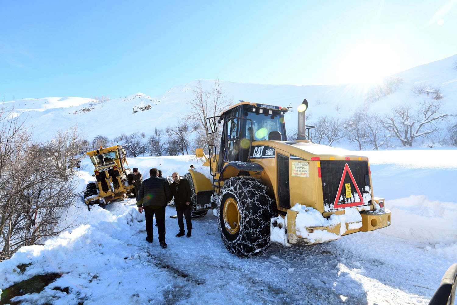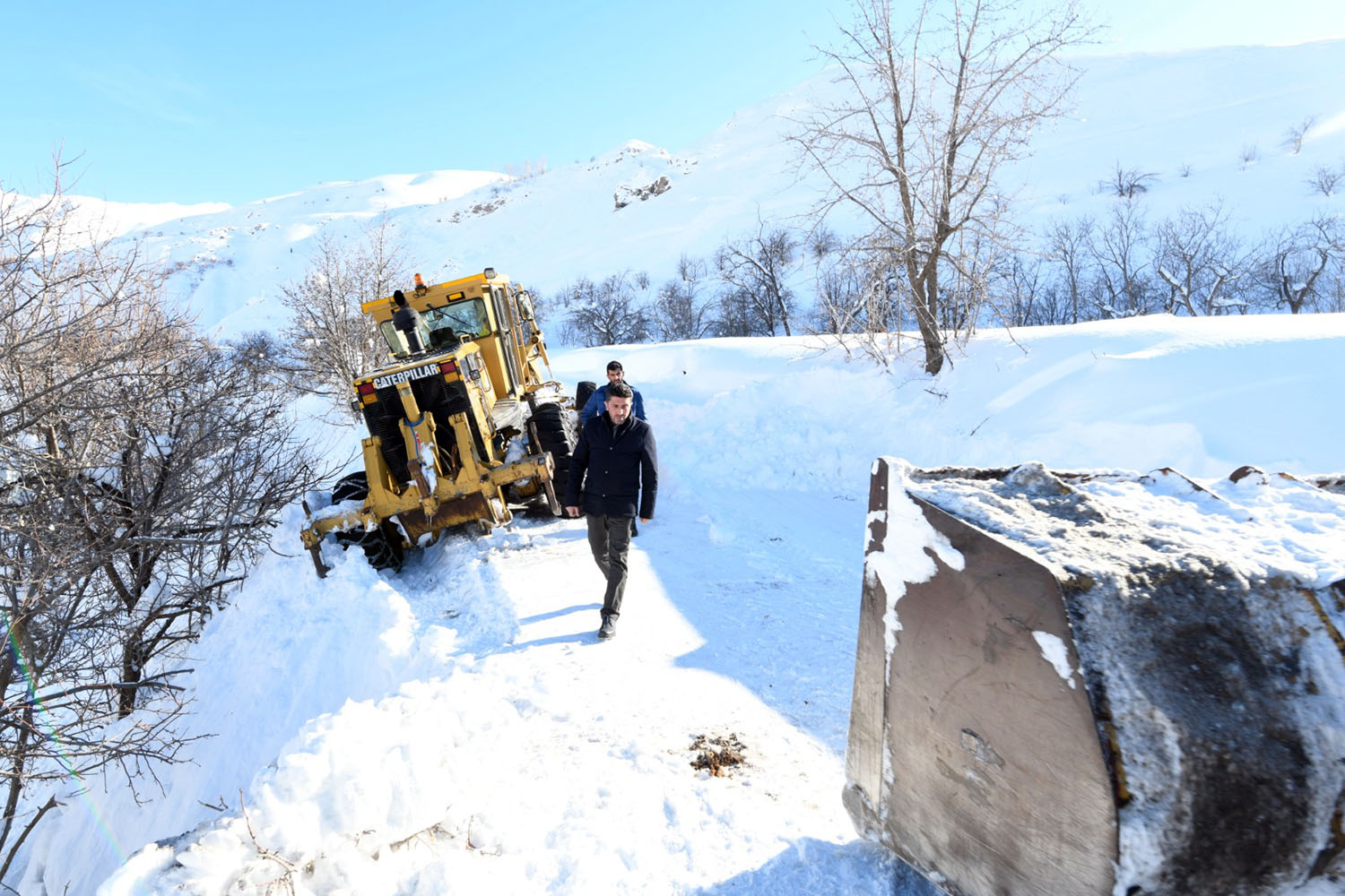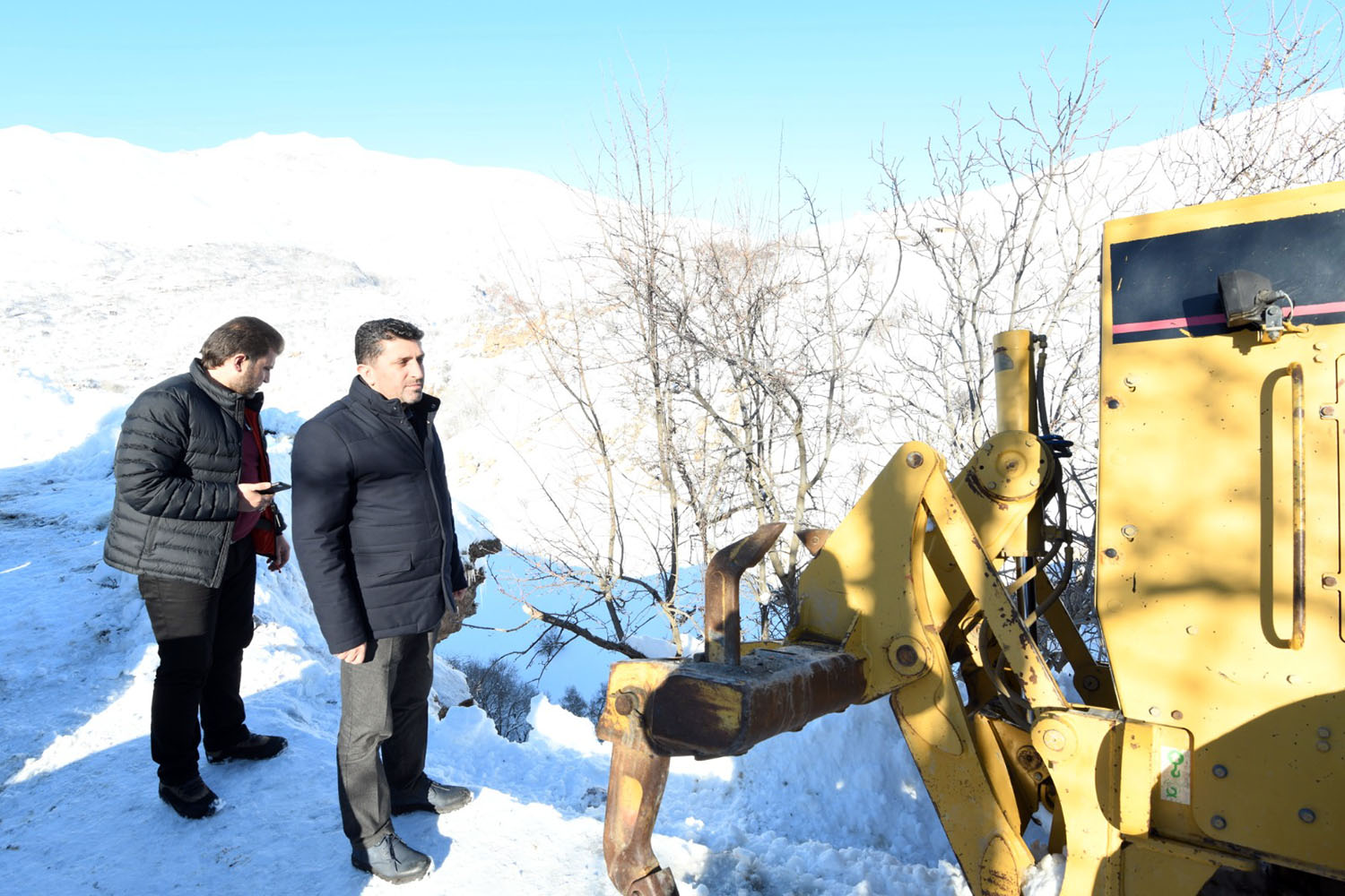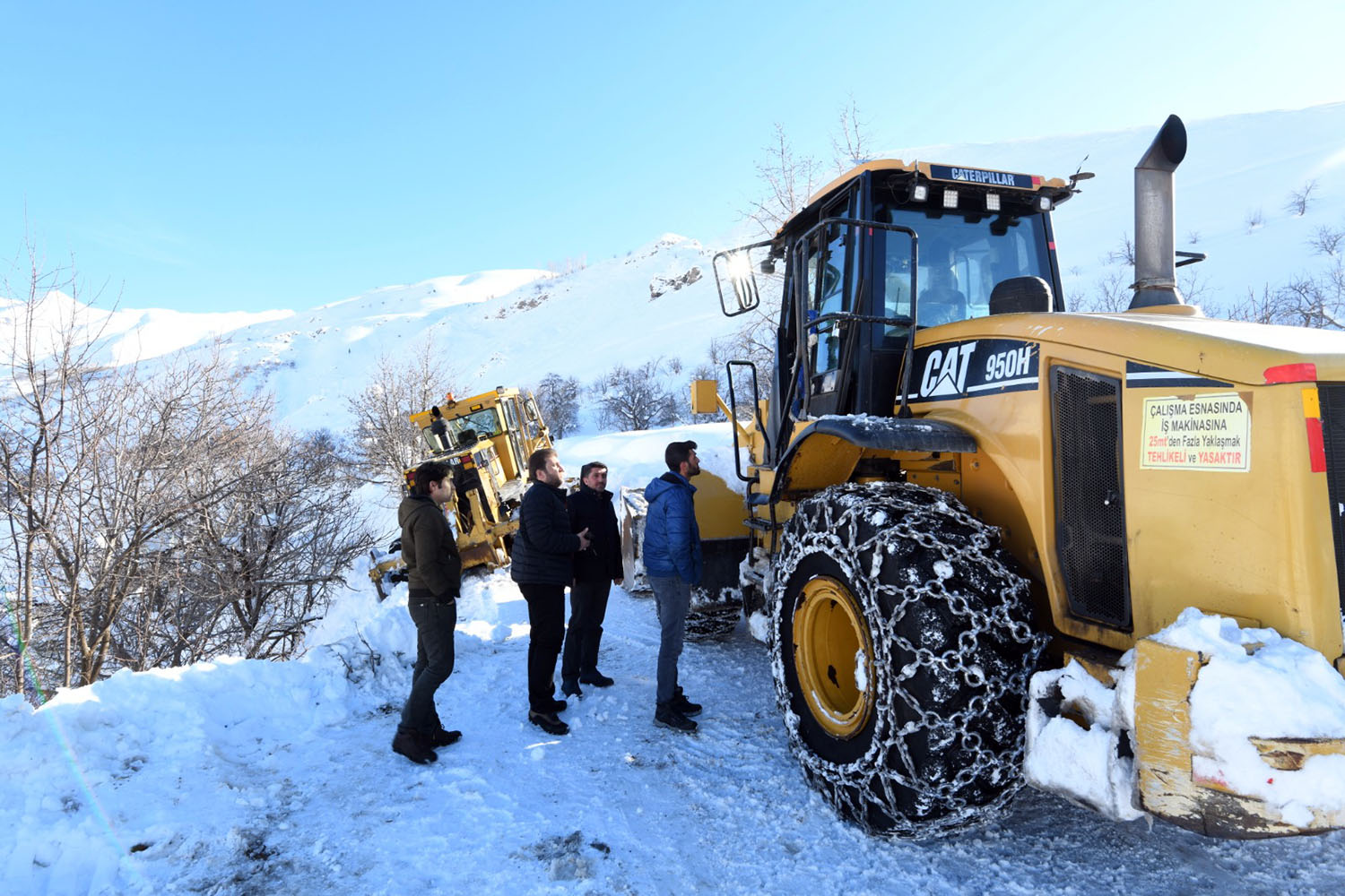 İlçemizde aşırı yağan kar ve gelen çığlardan ötürü kapalı olan köy yollarını ulaşıma açmaya çalışan ekipler zaman zaman zor anlar yaşıyor. Büyükşehir Belediyesi Çatak Şantiyesinde görevli iş makinası, Sözveren Mahallesi ve sokaklarında kapanan yolu açma çalışmaları sırasında yoldan kayarak mahsur kaldı. Mahsur kalan iş makinasının bulunduğu bölgeye Belediye Başkan Yardımcısı Cihan Yalçın ve AK Parti İlçe Koordinatörü İskender Şeylan giderek incelemelerde bulundu. İş makinasının uçuruma gitme ihtimali olduğundan Büyükşehir Belediyesi Çatak Şefi Hüseyin Duman ile görüşerek takviye iş makinaları talebinde bulundu. Yoldan kayan iş makinası diğer iş makinalarının desteği ile kurtarıldı.
